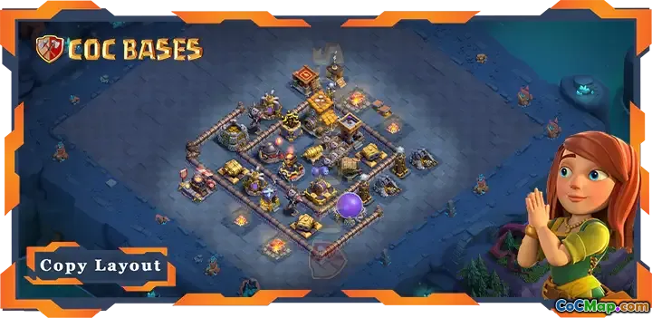 The Builder Hall Level 10 (BH10) base design in Clash of Clans is strategically arranged to offer strong defense against enemy attacks. The x-bow, a powerful defensive structure, is situated in the central part of the base, ensuring it can cover a wide area and deal substantial damage to approaching enemies. This central section is fortified with various other defensive structures, including spring traps, cannons, a multi-mortar, firecrackers, mega mines, and a mega tesla, creating an effective shield against enemy troops.
