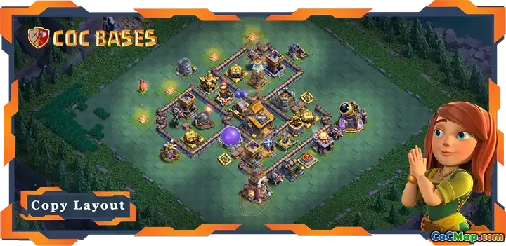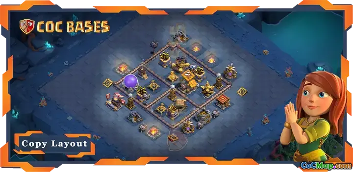 The Builder Hall Level 10 base layout in Clash of Clans is strategically designed to maximize defense and protect key structures. At the center of this base lies the Builder Hall itself, which serves as the focal point of the defense strategy. Surrounding the Builder Hall are important defensive buildings, including an air bomb and a lava launcher, which help to fend off aerial and ground attacks, respectively. The central placement of these defenses is crucial, as it allows them to cover a significant area and provide overlapping fire against attacking troops.