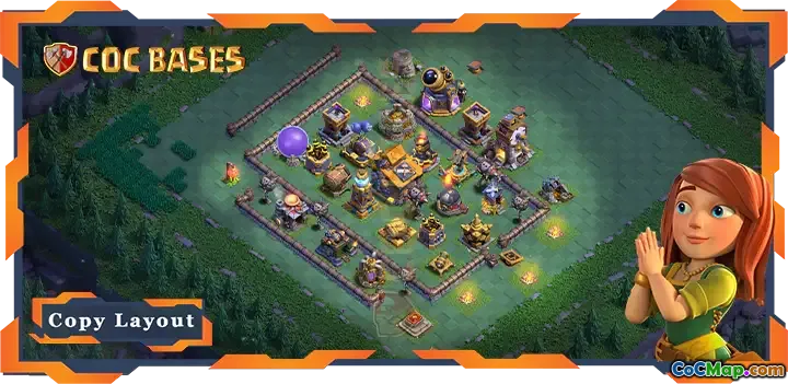 In addition to the builder hall, a variety of defensive units are strategically arranged around the center. Among these are a roaster, a mega tesla, and air bombs, which provide robust air defenses against enemy troops. The presence of a double cannon and a crusher further enhances ground defense capabilities. This thoughtful arrangement makes it challenging for attackers to penetrate through the defenses surrounding the builder hall.