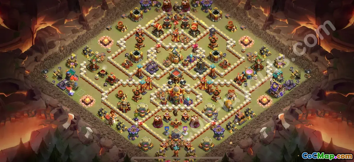 Designed for flexibility and resilience, this base layout is ideal for Clan War Leagues (CWL) with a focus on anti-air tactics. The configuration effectively confuses attackers using compartmentalization and strategic trap placement, reducing the effectiveness of Electro Dragon attacks and air-based strategies. Use this layout as a foundation to strengthen your defenses and secure more 3-star victories in your clan wars.