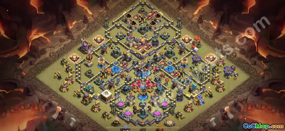 Effective Town Hall 18 CWL war base designed to prevent 2-star attacks, featuring anti-air defenses and Electro Dragon counter measures for 2025.