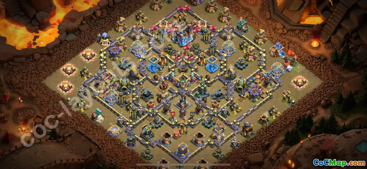 This top-tier TH18 war base layout is designed specifically to thwart opponents aiming for three-star victories in Clash of Clans CWL wars. It features strategic placement of defensive structures, heroes, and traps to maximize survival and disrupt enemy attack patterns, making it difficult for attackers to achieve three stars.