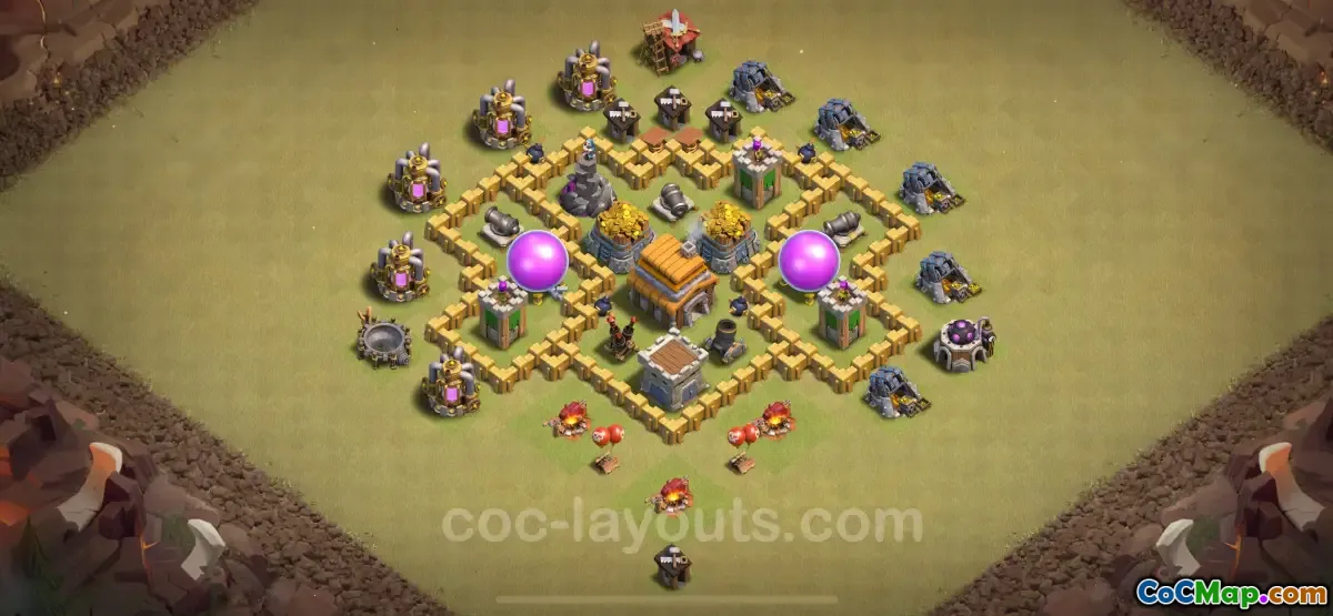 This specific design is characterized by a hybrid defense strategy, which cleverly combines elements of both farming and war base layouts. By positioning critical defensive structures strategically, players can create a setup that deters attackers from easily obtaining three stars. It offers a balanced defense that makes it challenging for enemies to target key components while still keeping resources secure.