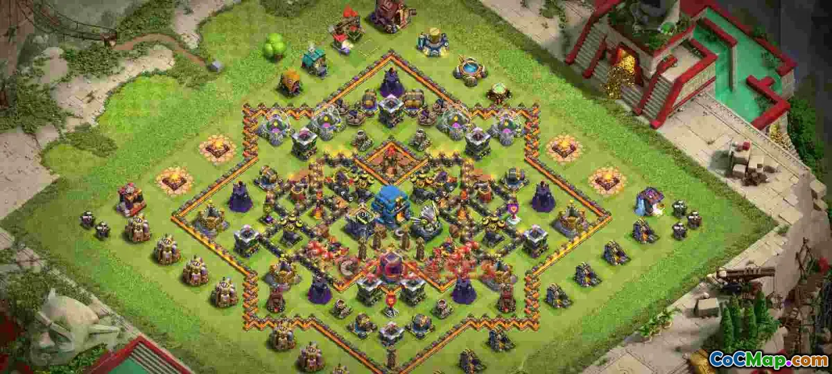 Included in this layout is a convenient copy link, allowing players to quickly set up their base with the same effective design. Whether you're seeking to improve your war performance or safeguard your resources, this classic TH12 map combines robust anti-air features with layered defenses to improve survivability and thwart enemy strategies efficiently.