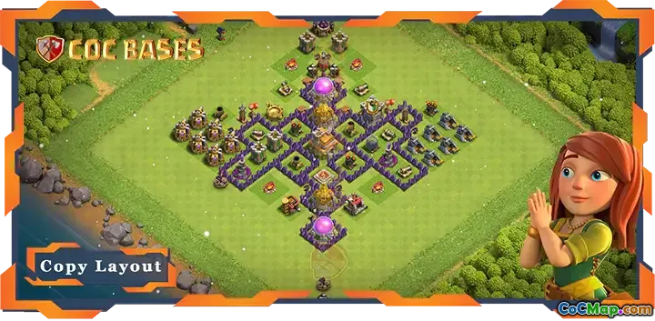 This TrollFunny TH7 base layout offers a creative and amusing design that confuses opponents while providing solid defense. Its clever placement of traps and walls makes it hard to achieve significant destruction.