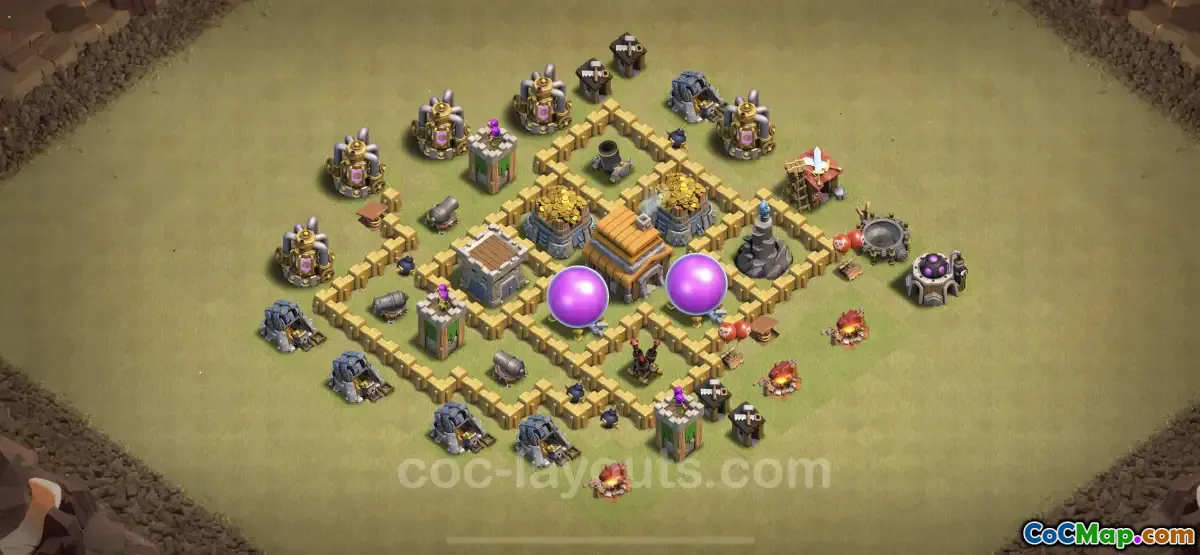 A key feature of the TH5 hybrid base is how it integrates both defensive and resource protection elements. The town hall is often placed centrally, surrounded by defensive structures such as cannons, archer towers, and mortars. This central positioning forces attackers to face multiple defenses, which can slow down their assault and potentially cause them to fail. Additionally, resource storages are strategically placed nearby, which helps to protect valuable resources from being looted during enemy attacks.