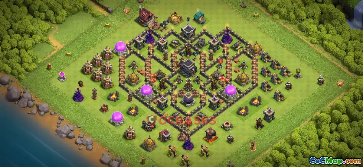 One of the key features of this base is its emphasis on safeguarding the resource storages, which are placed centrally within the base, surrounded by walls and defensive units. The design also incorporates traps and Secret Walls to mislead attackers and reduce the success rate of their raids. This setup encourages enemies to deploy spells and troops inefficiently, giving the defender a better chance of fending off resource theft. The base’s layout is suitable for players seeking a balanced approach to defending their loot while maintaining a farming-oriented gameplay style.