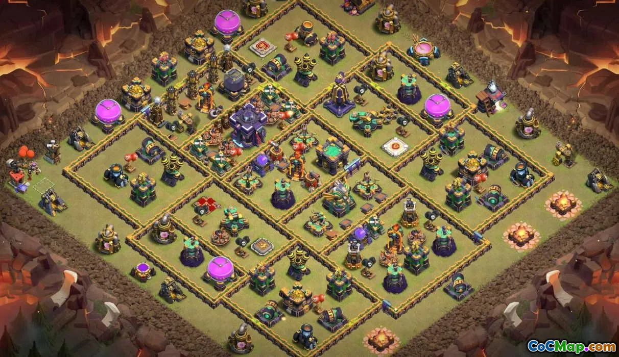 The design features strategically placed walls, defenses, and traps to create a balanced and resilient structure. It is intended to cover all critical points of the base, ensuring that attackers face numerous obstacles when trying to breach defenses. The layout also considers the placement of key buildings and resource storages to prevent easy looting and to safeguard vital assets during battles.