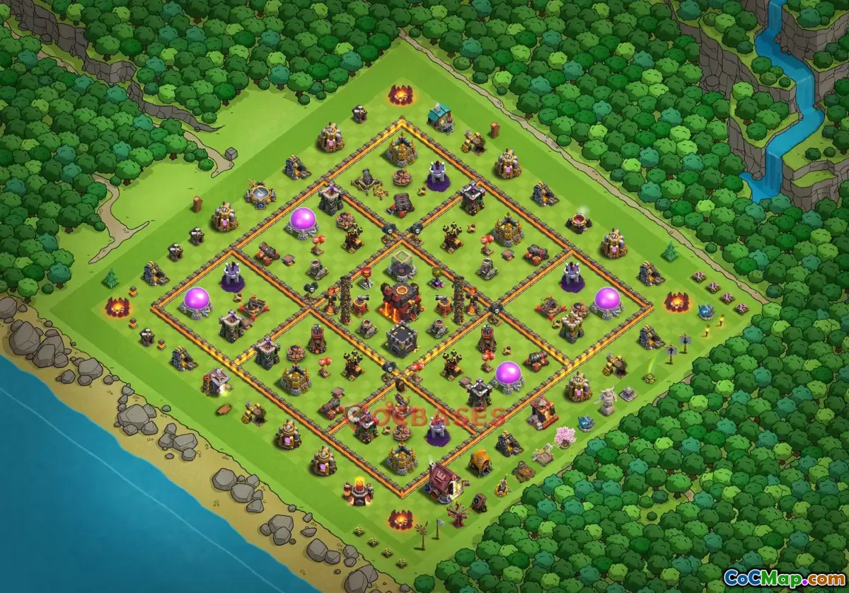 This Town Hall 10 trophy base is designed to offer balanced defense, protecting your resources and trophies effectively. Its layout features well-positioned walls and trap placements to deter attackers and maximize defensive coverage against various attack strategies.