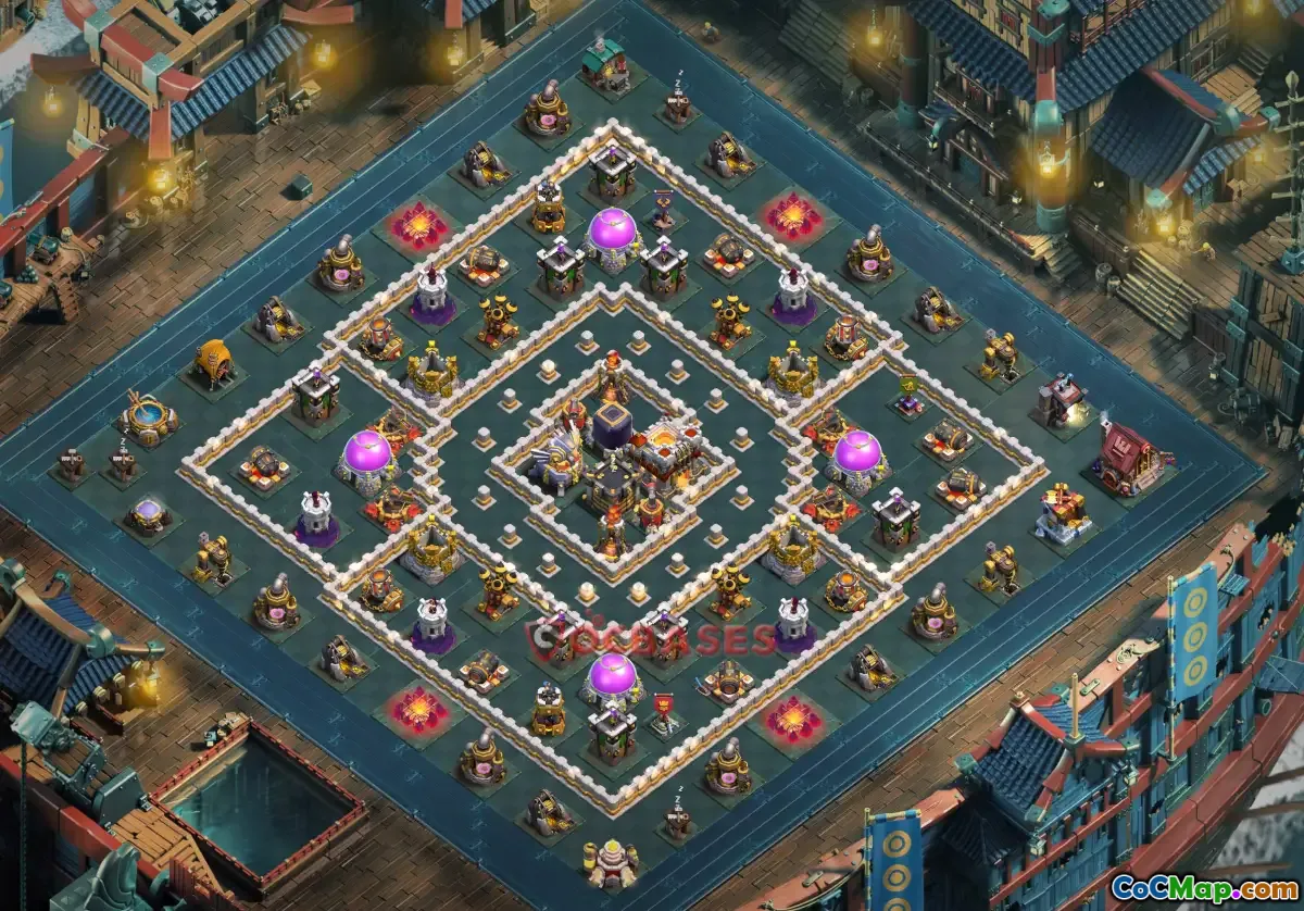 This Town Hall 11 trophy base is designed to maximize defense efficiency, protect resources, and sustain winning streaks in Clan Wars and multiplayer battles. With strategic placement of perimeters, traps, and defenses, it aims to deter enemy attacks and ensure a high shield time.