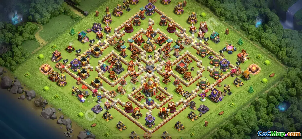 This Farming Base TH16 layout is expertly designed to maximize resource protection and minimize the risk of three-star attacks in Clash of Clans 2025. Its hybrid structure combines strong defensive placements with efficient resource storage placement, ensuring your resources remain safe during farming activities.