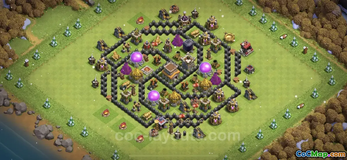 The design of a max-level TH8 base incorporates top-tier defensive structures and walls to maximize protection. Essential buildings such as cannons, archer towers, and wizard towers are placed in strategic locations to cover the entire base, helping to mitigate damage from various types of attacks. With full upgrades completed, players can leverage the strengths of these defenses to deter attackers effectively, as well as make the most out of their resources.