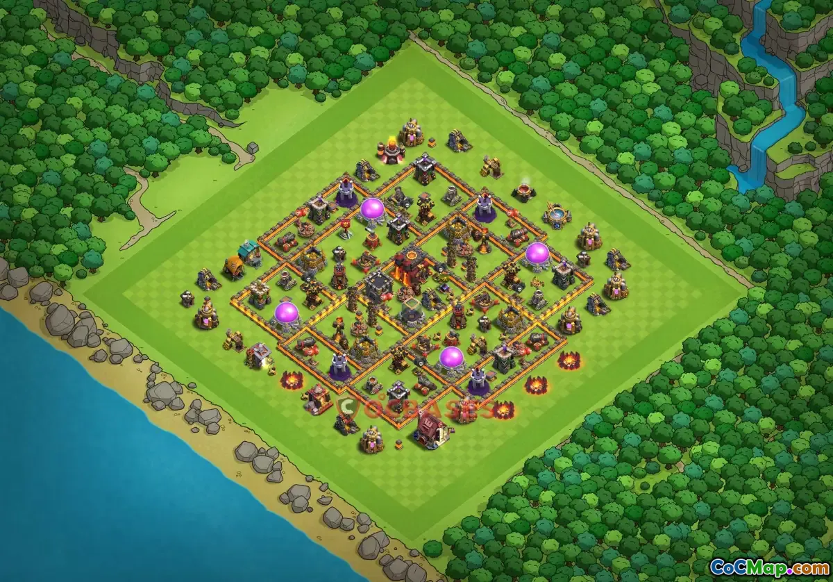 Developed specifically for Town Hall 10 players, this trophy base layout offers strong defensive placements to deter attackers focused on trophy protection. The design strategically places critical defenses such as the Eagle Artillery, Inferno Towers, and Heroes to maximize damage output while safeguarding storages and clan castles. The centralized core makes it harder for attackers to reach the most valuable assets, enhancing your chances of defending trophies effectively.