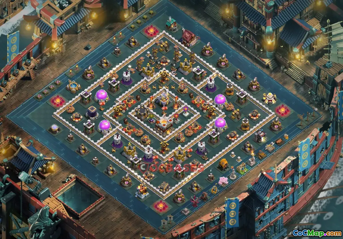 This Town Hall 11 hybrid base is expertly designed to balance strong offense and robust defense, making it ideal for both farming and Clan War battles. Its layout features well-placed defensive structures, including Archer Towers, Cannons, and Air Defenses, strategically positioned to cover key entrances and vital resources.