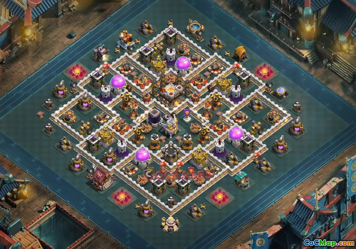 This Town Hall 11 trophy base is strategically designed to maximize protection against attackers aiming for top trophies. With well-placed defenses, traps, and compartments, this layout ensures your resources and trophy count stay secure. The base is also optimized to defend against popular attack strategies common at TH 11, such as Lavaloon, ElectroDragon, and Queen Walks.