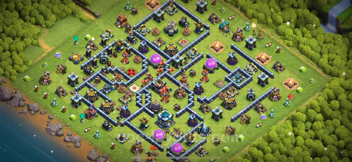 The specifics of the TH13 base include features that balance defense and offense, suitable for hybrid gaming styles. It is crucial to position defensive structures effectively to thwart enemy attacks, ensuring that players can maintain their trophies even against stronger opponents. The layout is crafted with the intention of providing a robust defense by strategically placing key defenses such as Inferno Towers, Eagle Artillery, and Clan Castle in critical areas, making it challenging for attackers to achieve a three-star victory.