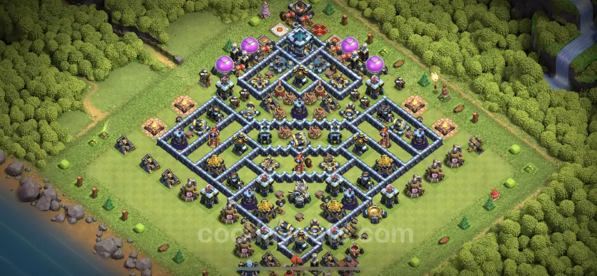 The Trophy Base for Town Hall 13 in Clash of Clans is designed specifically for players seeking to improve their trophy count while effectively defending against various types of attacks. Featuring an anti-everything strategy, this base layout ensures that it can withstand assaults from a variety of opponents, making it a versatile choice for Trophy collectors. The layout is carefully crafted to protect key structures and resources while discouraging attackers from successfully looting or winning the battle.