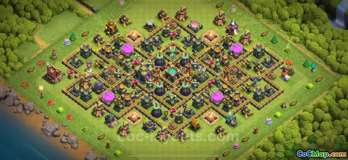This description introduces a Clash of Clans base layout designed specifically for Town Hall 14 players. The primary focus of this base is to help players in trophy collection, making it ideal for those aiming to increase their ranking and rankings in the game. The layout is optimized for defense, providing strong protection against attacking enemies, especially for trophy pushing purposes at the TH14 level.