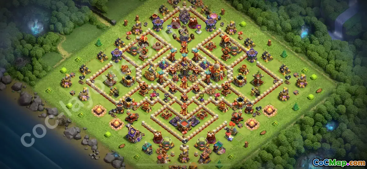 This Town Hall 16 trophy defense base is meticulously designed to maximize protection against attackers aiming for high trophies. It features strategic placement of Air Defense, Archer Towers, and Wizard Towers to create a robust Anti-Air environment, effectively countering Electro Dragons and air-based attacks. The layout also incorporates well-shielded core compartments to deter wall breakers and ensure key defenses remain intact during raids.