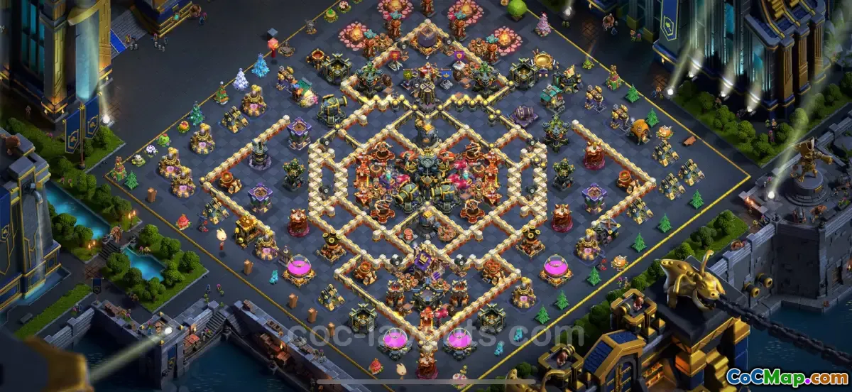 The Trophy Base designed for Town Hall Level 17 in Clash of Clans is optimized for defensive strategies aimed at collecting trophies effectively. This base layout is tailored to protect key resources and ensure that players retain their hard-earned trophies during battles. Players can copy this base layout for their own game use, enhancing their competitive edge in the world of Clash of Clans.