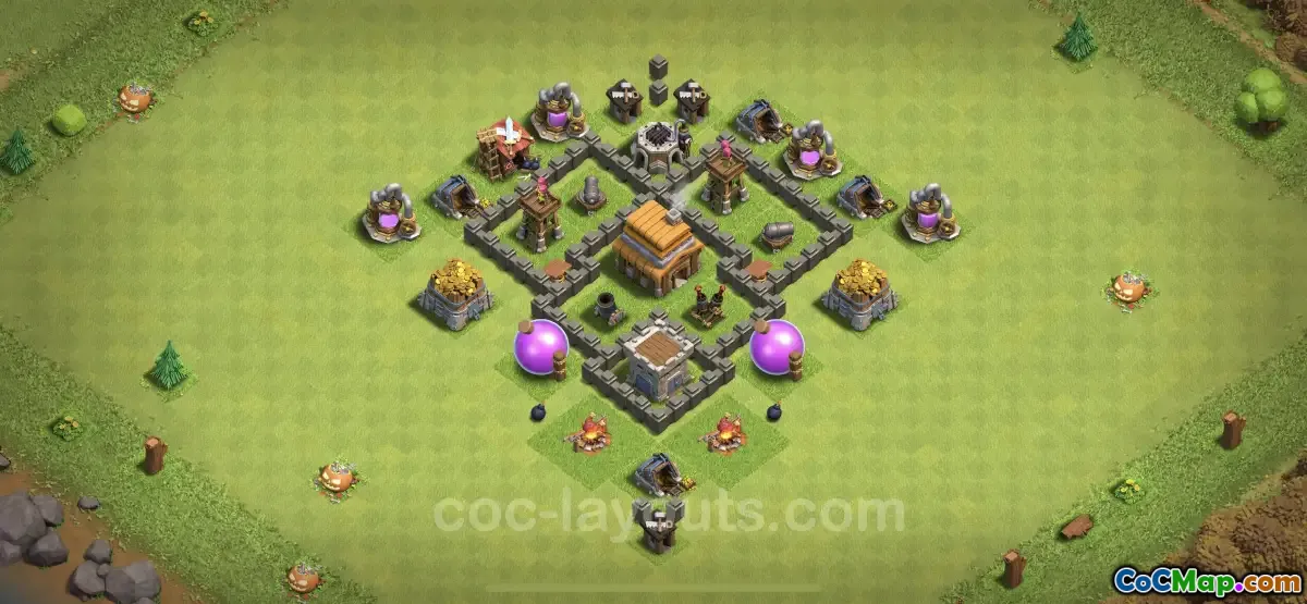 Discover the best Trophy Base TH4 layout for Clash of Clans! Optimize your defense with our anti-everything design and easy link for copy.