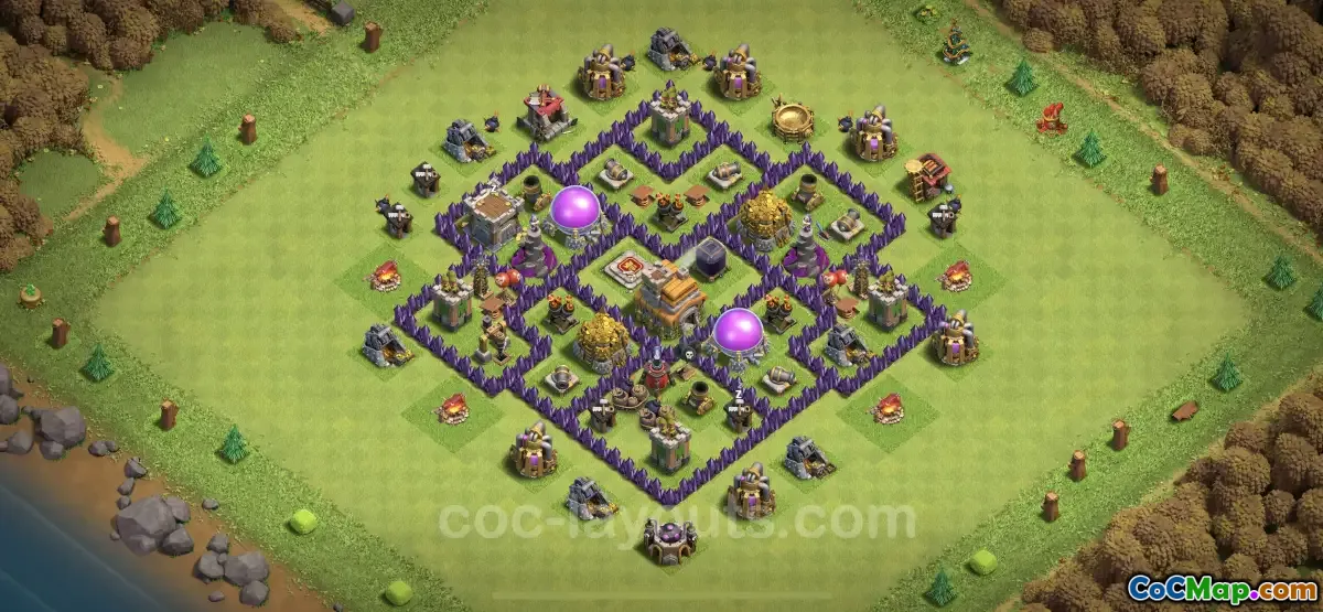This particular base design is also classified as hybrid, as it exhibits characteristics suitable for both farming and trophy defense. The strategic placement of key defensive structures and the layout provides a multifaceted approach to gameplay, balancing the need for collecting resources while maintaining a strong defense. Players can find the layout via a link, allowing them to easily replicate the design in their own game for improved effectiveness.