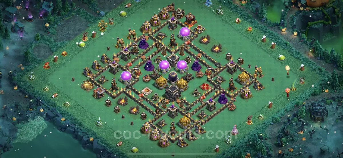This hybrid farming base aims to secure both resources and trophies, allowing players to enjoy a sustainable and efficient gameplay experience. The design incorporates elements that deter enemy troops from easily accessing storages and Town Hall, while also providing a robust defense mechanism against ground and air units. By utilizing walls, traps, and defensive structures effectively, the base can repel various forms of attacks, safeguarding collected resources.
