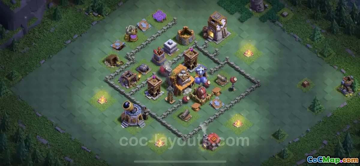 Additionally, the design offers an effective way to safeguard important resources and the Builder Hall itself. By utilizing a combination of defenses, including traps and various defensive buildings, the base layout ensures that attackers must expend significant effort to breach the defenses. The creators of this base have included their design link, allowing players to easily copy and implement the layout into their own villages, maximizing the defensive potential for Builder Hall Level 4.