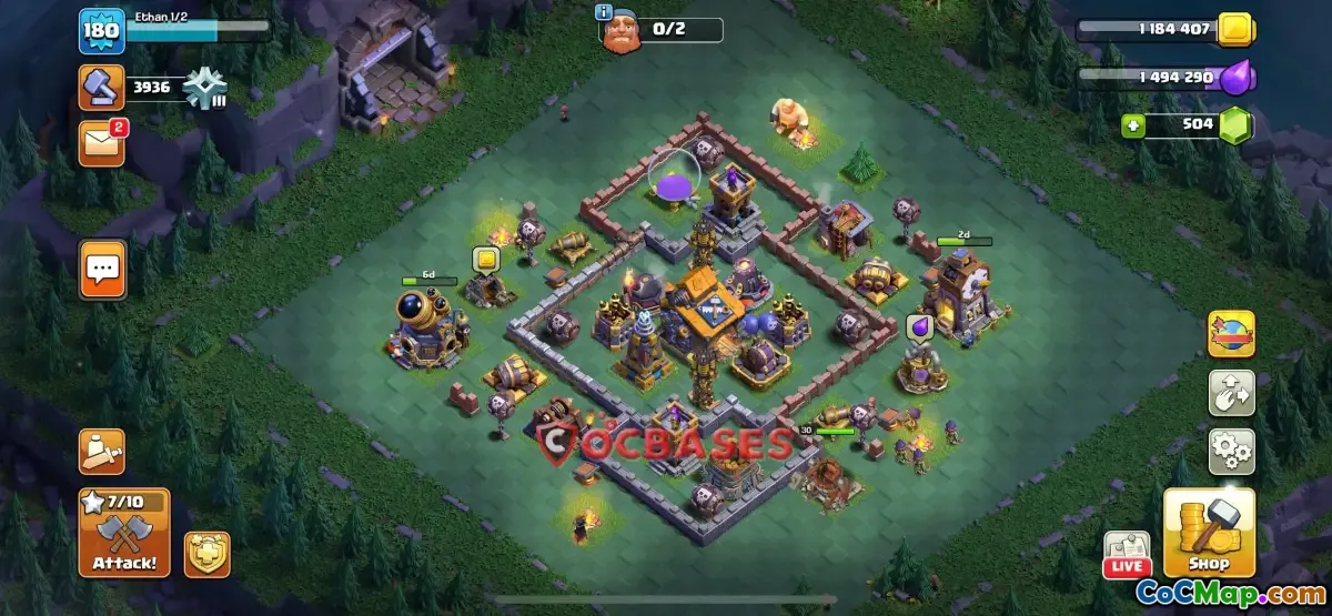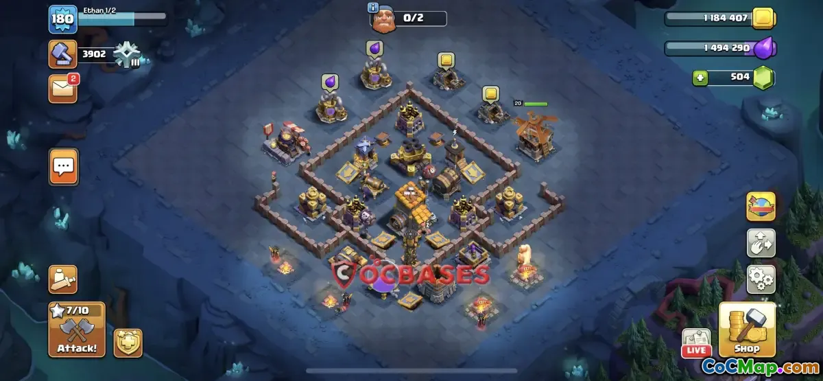 Discover the ultimate Builder Hall 10 trophy base for Clash of Clans! Strategically designed to protect trophies with a missing X-Bow. Anti 6-star setup!
