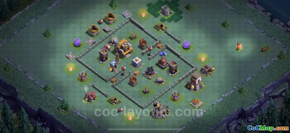 This Builder Hall Level 5 base features innovative layout choices that exploit the game's mechanics, making it challenging for attackers to secure an easy victory. By using a well-thought-out configuration, players can thwart most offensive strategies, thereby increasing their chances of winning battles. The design is shared along with a link, allowing users to easily copy and implement the layout in their own games. This accessibility ensures that players can quickly improve their defense without needing extensive design skills or experience.
