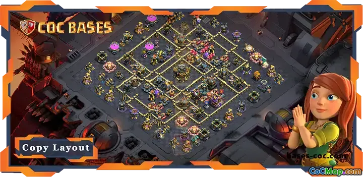 This expertly designed TH17 base layout offers strong defensive structures aimed at preventing opponents from securing 3 stars in Clan War battles. Its strategic placement of X-Bows, Inferno Towers, and Clan Castle creates a resilient shield around the core, making it difficult for attackers to penetrate and secure a quick victory.