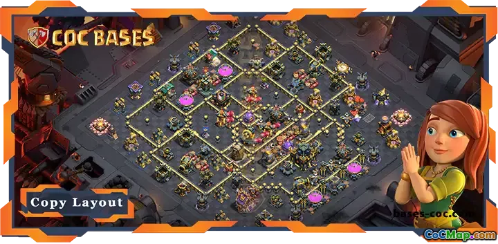 This top TH17 base layout offers a balanced defense setup ideal for Clan War Leagues, combining strong centralized defenses with well-placed traps and walls to thwart enemy strategies. Its design emphasizes safeguarding key resources and Town Hall, making it highly effective in clan wars and multiple attack scenarios.