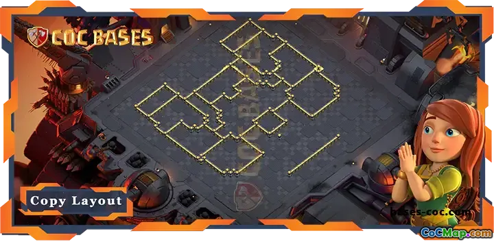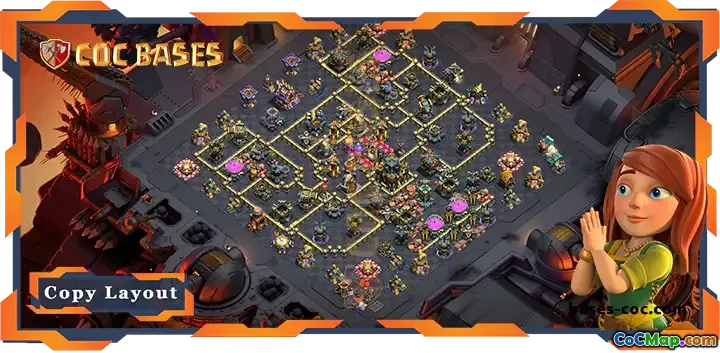 This top TH17 hybrid base design offers a balanced layout that combines strong defensive structures with strategic placement of traps and walls, making it ideal for both War and Clan War League battles. It is crafted to protect crucial assets such as the Town Hall, Clan Castle, and resource storages while providing excellent room for defenses and heroes to cover key attack routes.