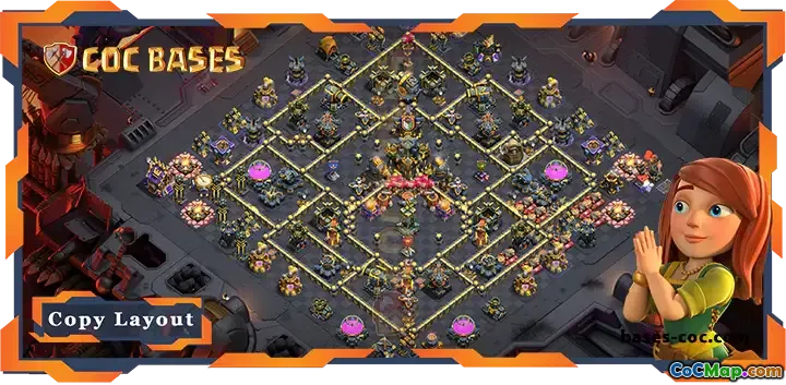 This top-tier TH17 war base layout is specifically crafted to thwart enemies aiming for a 3-star victory. Its strategic placement of defenses, traps, and heroes creates formidable obstacles that restrict attackers' progress, making it difficult to achieve full stars.