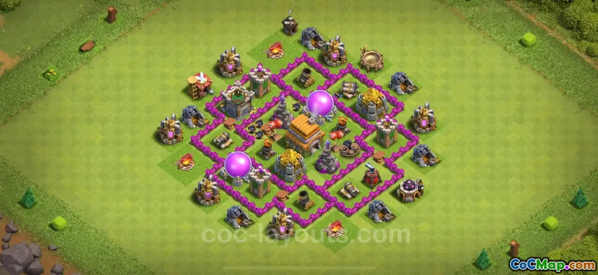 One of the key features of the TH6 base design is the strategic placement of defensive structures. The layout typically emphasizes defensive buildings like cannons, archer towers, and wizard towers, ensuring they are positioned to cover as much area as possible. These defenses are arranged in a way that creates a formidable barrier against attackers while also safeguarding the core of the base, where the Town Hall and storages are located.