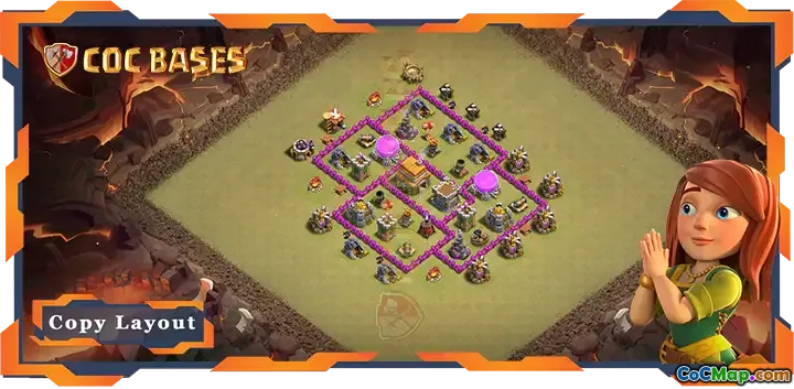 This top-tier TH6 war base is strategically designed to defend against common attack strategies and prevent 2-star completions. It features well-placed bombs, traps, and centralized resources to divert attackers and minimize damage.