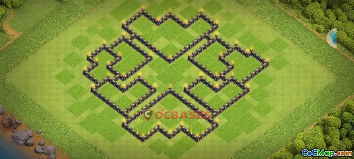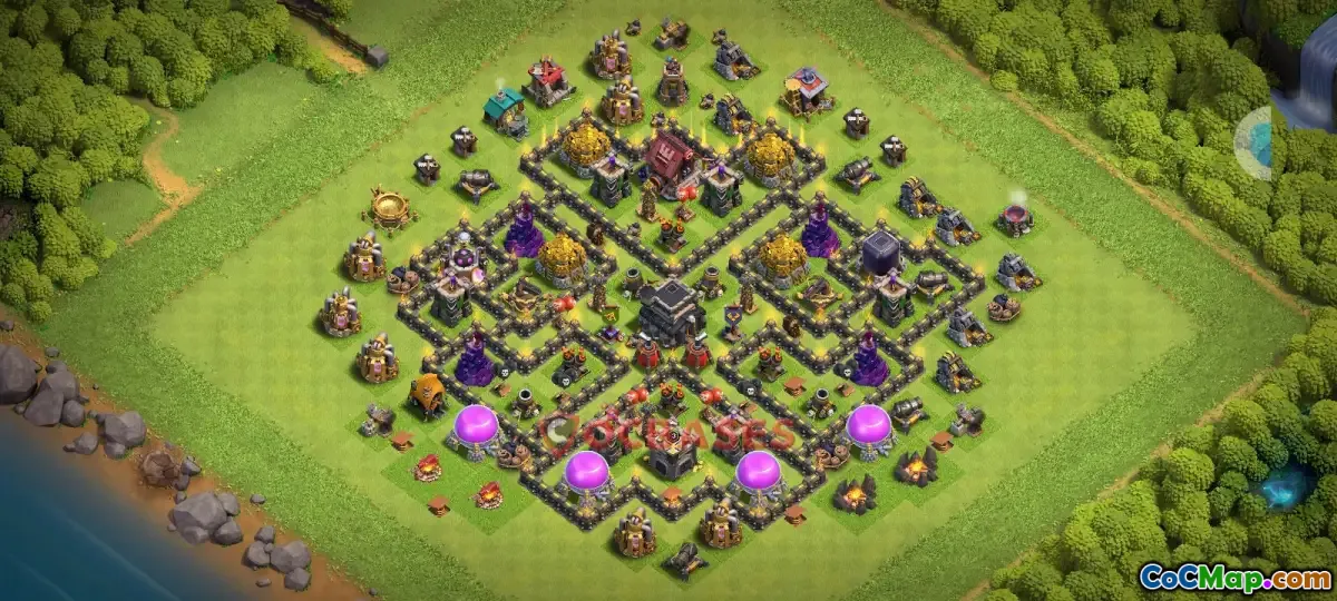 This Town Hall 9 war base is designed with a balanced hybrid defense layout, providing strong protection against both aerial and ground attacks. Its strategic placement of traps, walls, and defensive buildings ensures a resilient fortress capable of frustrating enemy troops during clan wars.