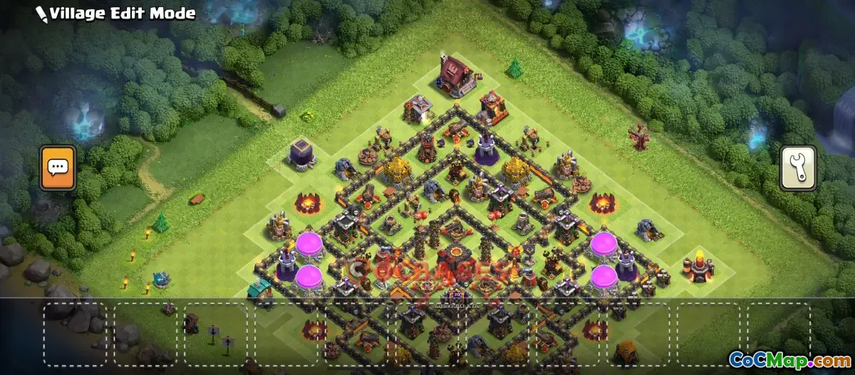 Designed for competitive war scenarios, this layout emphasizes centralized heroes and a strategic placement of traps to catch attackers off guard. It’s optimized for clan wars, providing both strong defense and easy copying, making it an ideal choice for TH10 clans aiming for victory.
