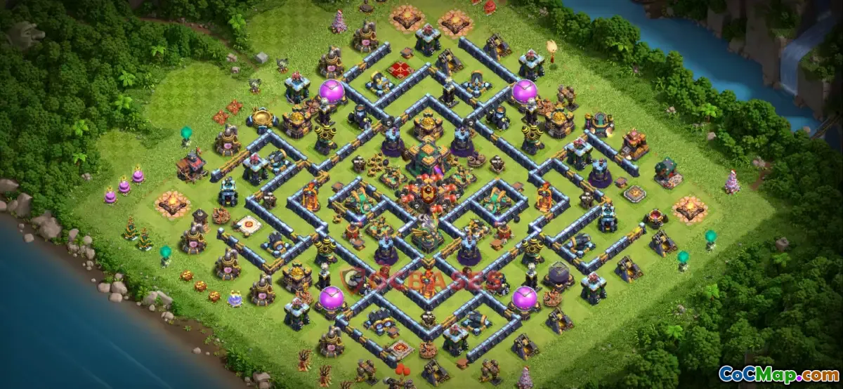 The Town Hall 14 war base in Clash of Clans is designed specifically for competitive gameplay, focusing on defense against various attack strategies. This base layout is crafted to resist attacks during wars, Clan War Leagues (CWL), and trophy pushes. Its structure aims to maintain a balance between protecting resources and the town hall itself, creating a fortress that requires strategic planning from attackers to overcome.