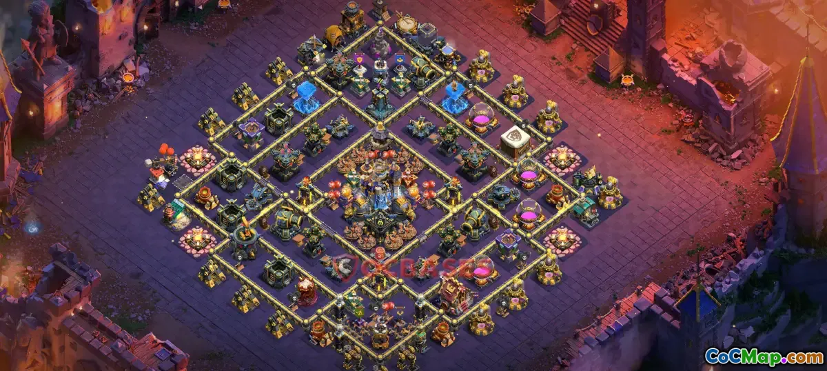 This Town Hall 18 war base is designed to maximize protection of key defenses and resources, making it ideal for clan wars. Its well-structured layout features centralized Storages and defensive units, ensuring attackers face a tough challenge. The strategic placement of Inferno Towers, Eagle Artillery, and Clan Castle creates a strong defensive perimeter that effectively slows down enemy troops and prevents quick突破.