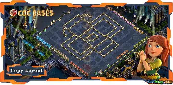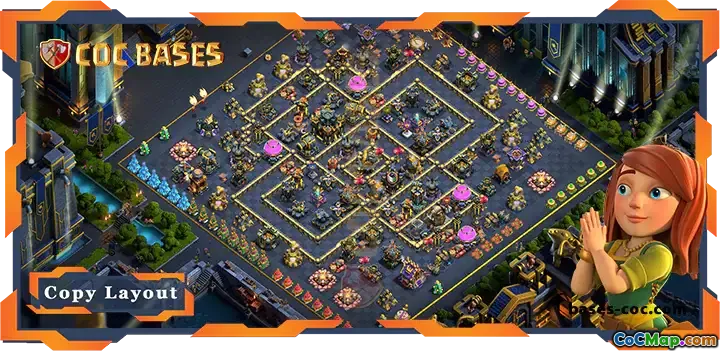 The layout features a centralized core with carefully positioned traps andClan Castle placement to surprise attacking troops. It is optimized for trophy pushing and resource protection, making it a reliable choice for players looking to maintain or increase their ranking. Its strategic design and defensive features make it a formidable challenge for any attacker, ensuring a higher chance of defending against high-level raids.