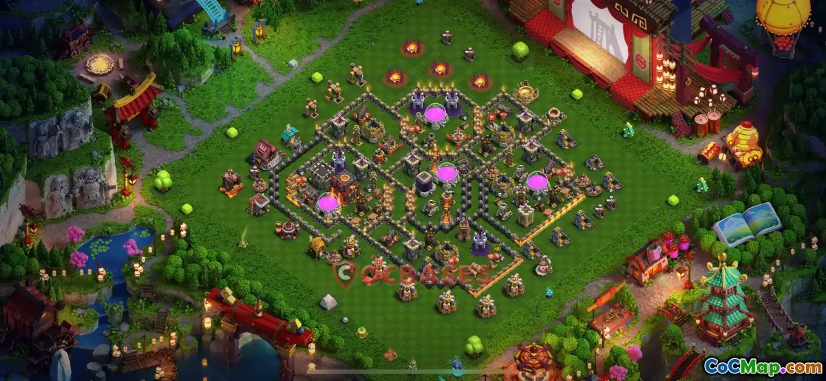 This Town Hall 10 hybrid base in Clash of Clans is designed to balance defense against both attacking strategies involving ground and air units. It emphasizes protecting resources and the Town Hall by creating a well-structured layout that disperses key defenses around the base. The strategic placement of walls, traps, and defenses aims to prevent attackers from easily breaching the core of the base, making it more difficult for them to earn trophies or steal resources quickly.
