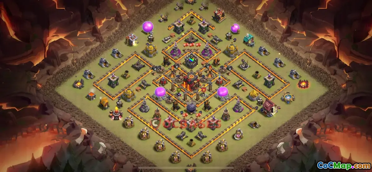 This Town Hall 10 war base layout is optimized to protect your resources and defenses during clan wars. It strategically places defenses, traps, and the Clan Castle to create a robust shield against enemy attacks, helping to minimize your losses and increase your win rate.