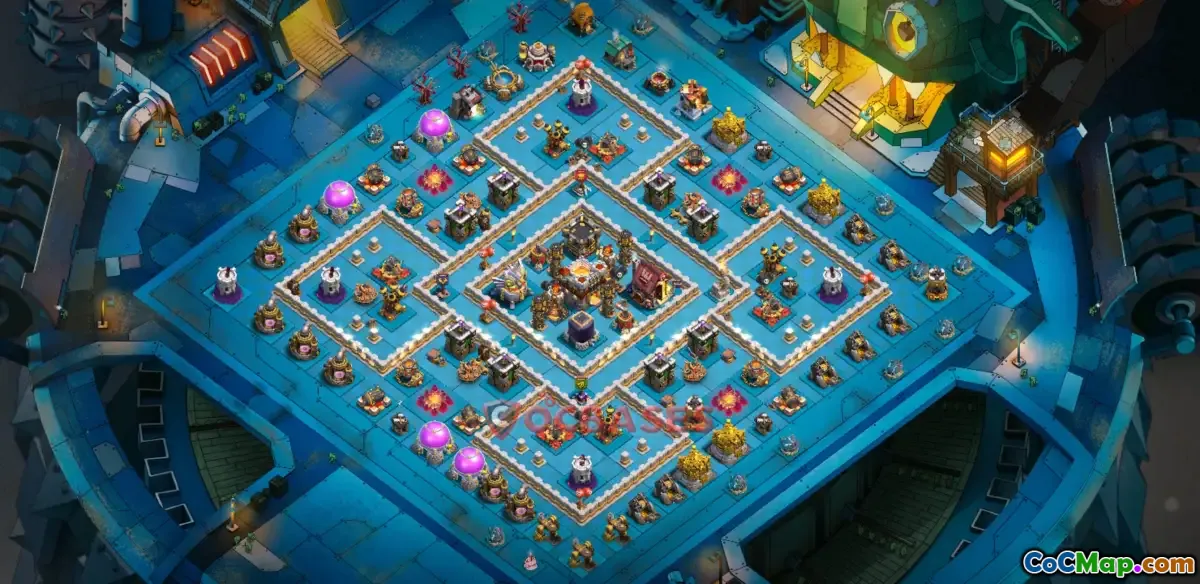 This Town Hall 11 hybrid base layout provides a strategic balance between protecting resources and defending against attacks. Its well-placed walls, defensive structures, and troop compartments make it difficult for enemies to breach the core while safeguarding key assets.