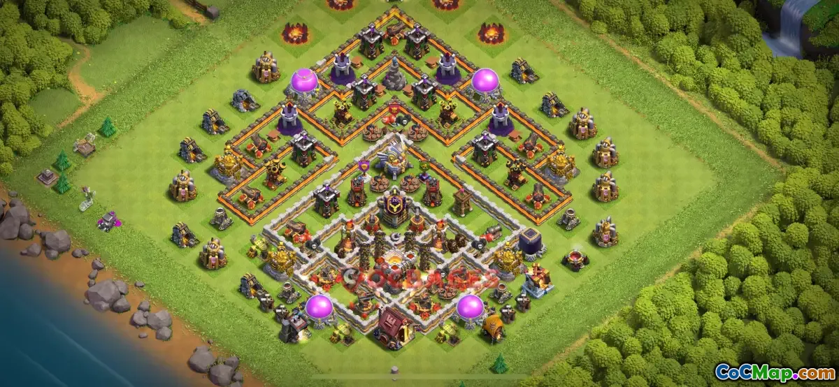 This Town Hall 11 trophy base in Clash of Clans is designed to help protect your trophies from being lost during attacks. It features a strategic layout that prioritizes defending against high-damage attacks, making it difficult for opponents to achieve a 3-star victory. The base design incorporates well-placed defenses, walls, and traps to create a strong fortress around the Town Hall and key resource buildings.