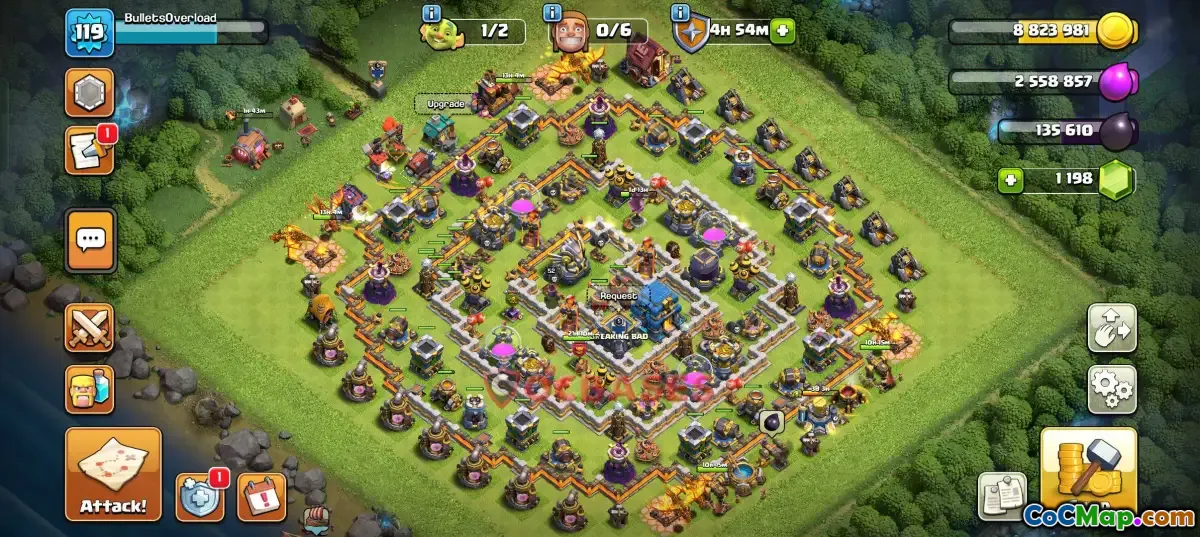This Town Hall 12 hybrid base is optimized for balanced defense and resource protection, making it ideal for both war and farming. Its strategic placement of key defenses, such as infernos, X-bows, and splash damage, creates a formidable barrier against attacking troops.