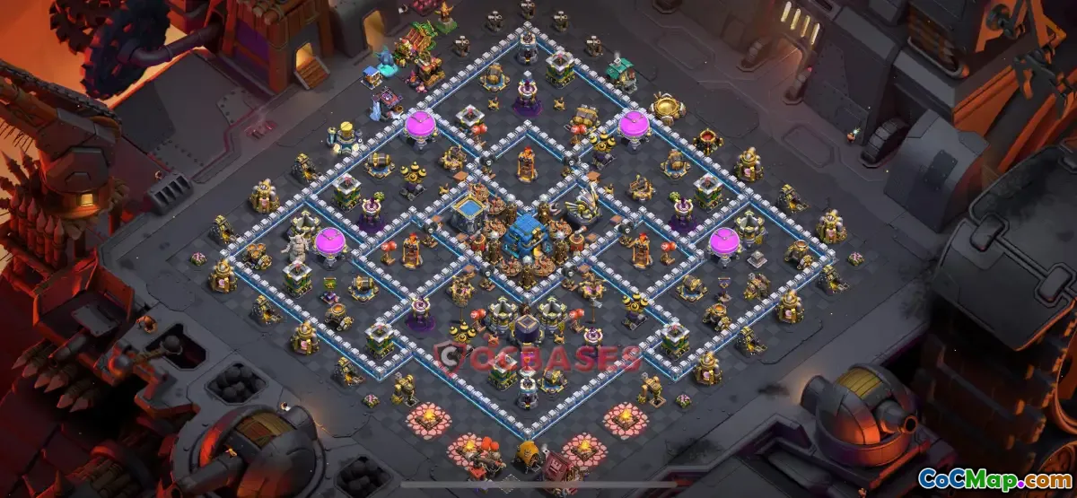 This Town Hall 12 trophy base layout for Clash of Clans is designed to effectively protect your resources and defend against enemy attacks. It features a well-organized structure with the Town Hall positioned centrally, making it a key focal point for attackers and increasing its chances of survival during raids. The strategic placement of defenses such as inferno towers around the Town Hall further enhances its ability to fend off high-level attackers.