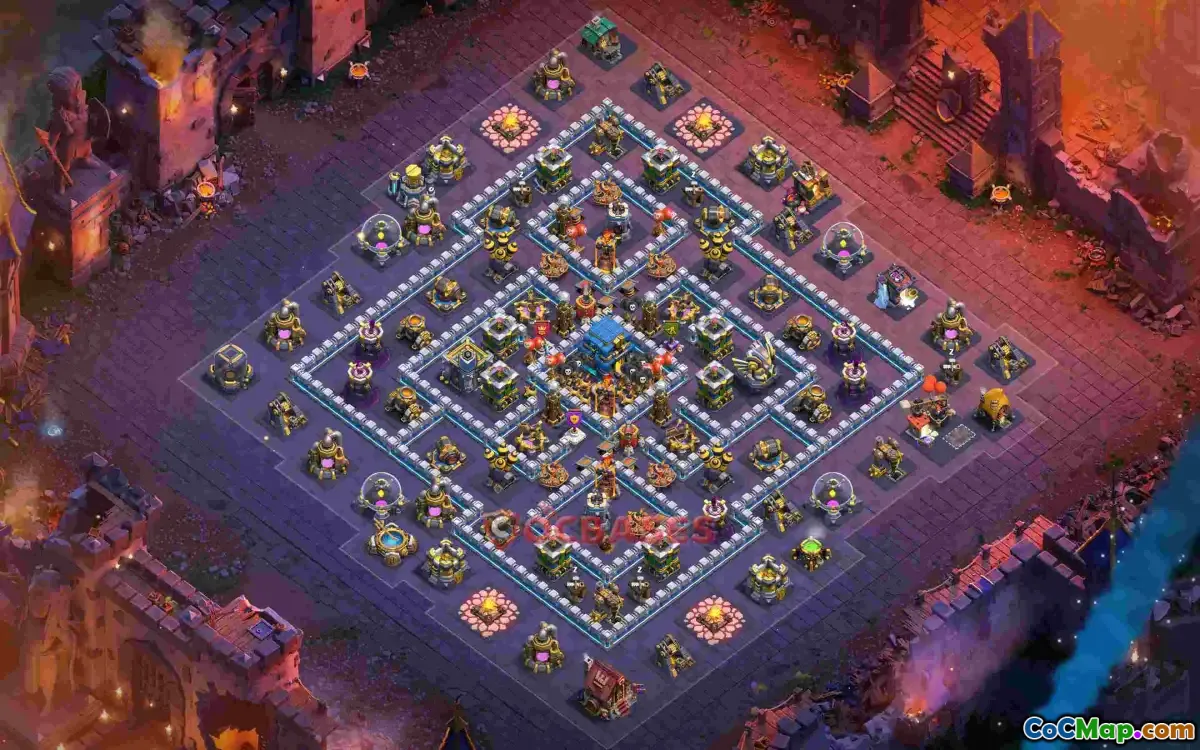This Town Hall 12 war base layout with ID 5nojq offers a robust defense structure tailored for clan wars, farming, and trophy pushing. Its asymmetric design emphasizes centralized defenses and layered traps to thwart common attack strategies including Electro Dragon, Ice Golem, and Witch compositions.
