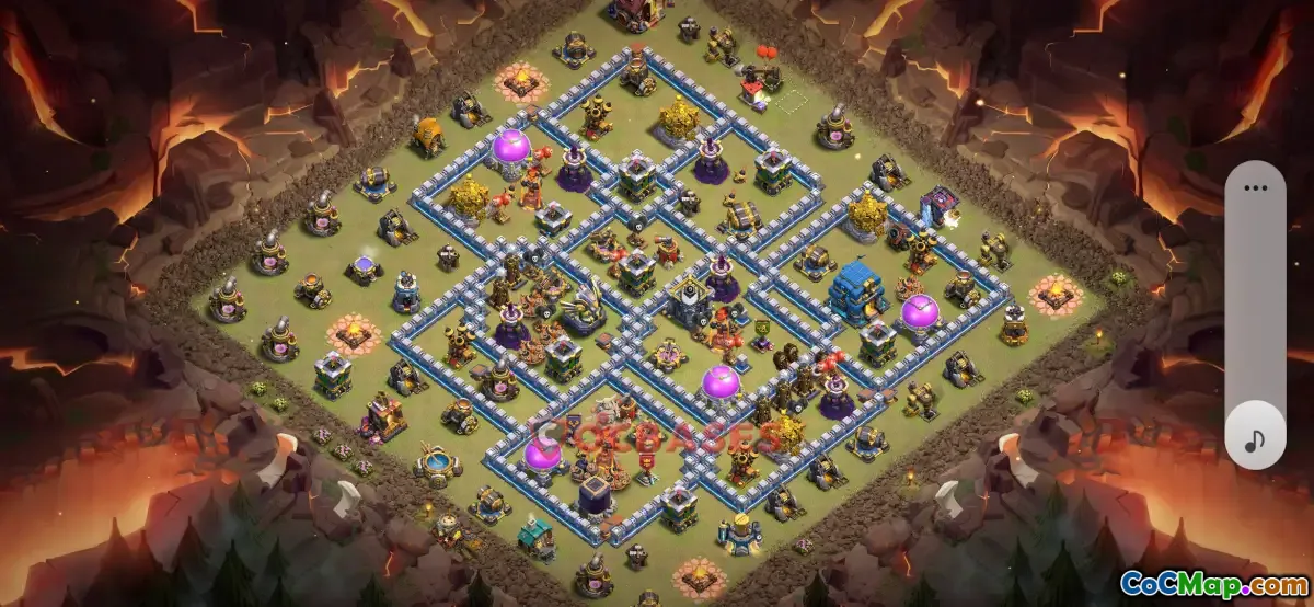 This Town Hall 12 war base is expertly crafted to lure opponents into a false sense of security by making the Town Hall appear vulnerable. Once enemy troops commit to the attack, they are directed straight into the core of the base, where they face Clan Castle troops and powerful multi-inferno towers. The layout is particularly effective against Dragon and Super Witch strategies, punishing careless funneling and forcing costly troop losses.