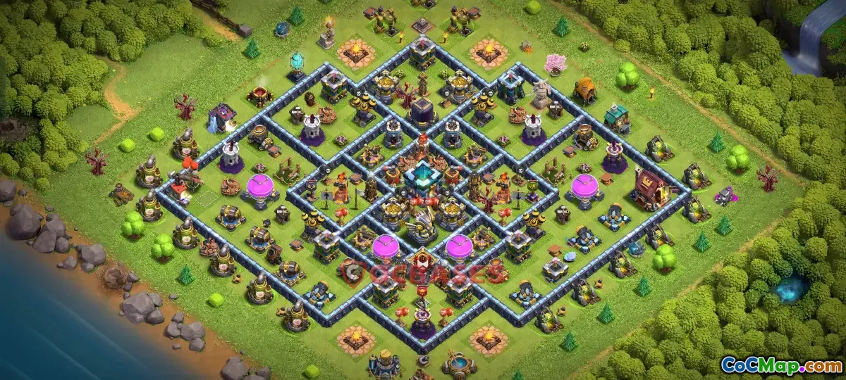 This Town Hall 13 Clash of Clans CWL base is specially crafted to offer strong defense and high durability during clan war attacks. Its layout includes well-protected defenses and effective trap placements, enhancing resistance against common attack strategies, including fire spells and lightning strikes.